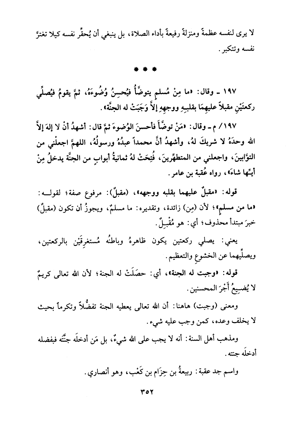 197 - وقال: "ما مِنْ مُسلم يتوضَّأُ فيُحسِنُ وُضُوءَهُ، ثمَّ يقومُ فيُصلِّي ركعتَيْنِ مقبلًا عليهِمَا بقلبِهِ ووجهِهِ إلَّا وَجَبَتْ له الجنَّة".