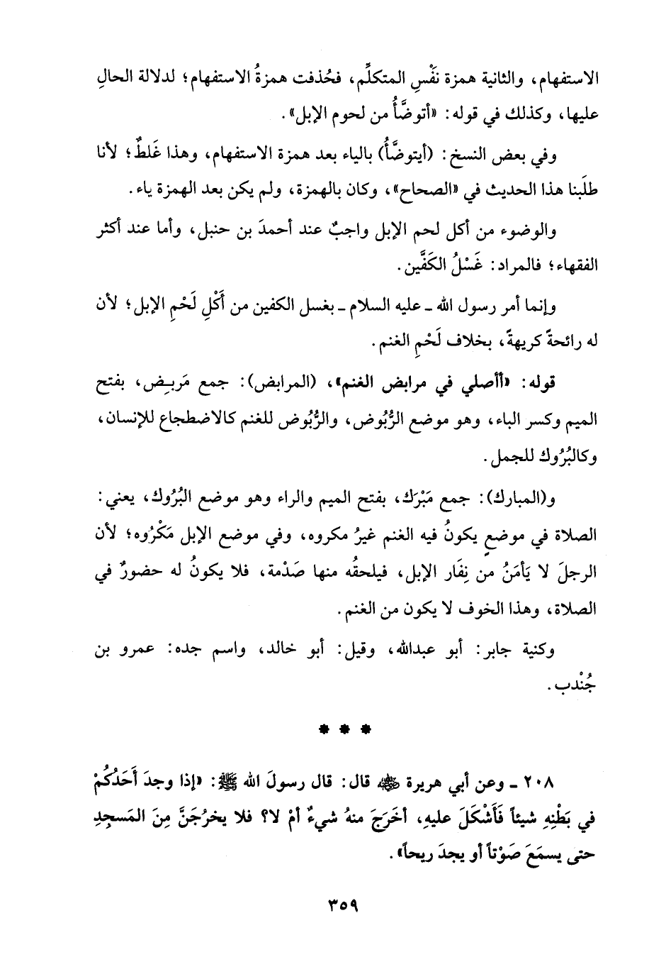 208 - وعن أبي هريرة - رضي الله عنه - قال: قال رسولَ الله - صلى الله عليه وسلم -: "إذا وجدَ أَحَدُكُمْ في بَطْنِهِ شيئًا فَأَشْكَلَ عليهِ، أخَرَجَ منهُ شيءٌ أمْ لا؟ فلا يخرُجَنَّ مِنَ المَسجِدِ حتى يسمَعَ صَوْتًا أو يجدَ ريحًا".