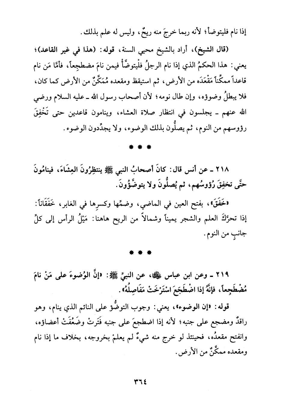 218 - عن أنس قال: كانَ أصْحابُ النبي - صلى الله عليه وسلم - ينتظِرُونَ العِشَاءَ، فينامُونَ حتَّى تخفِقَ رُؤوسُهم، ثم يُصلُّونَ ولا يتوضَّؤُونَ.