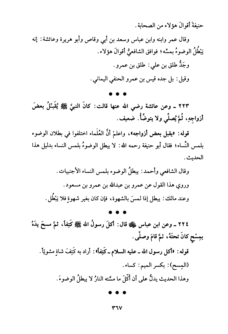 223 - وعن عائشة رضي الله عنها قالت: كانَ النبيَّ - صلى الله عليه وسلم - يُقَبِّلُ بعضَ أزواجِهِ، ثُمَّ يُصلِّي ولا يتوضَّأْ. ضعيف.