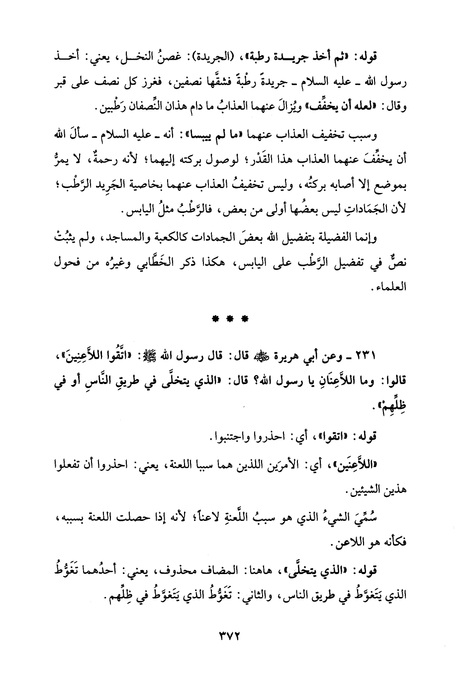231 - وعن أبي هريرة - رضي الله عنه - قال: قال رسول الله - صلى الله عليه وسلم -: "اتَّقُوا اللَّاعِنِينَ"، قالوا: وما اللَّاعِنَانِ يا رسول الله؟ قال: "الَّذي يتخلَّى في طريقِ النَّاسِ أو في ظِلِّهِمْ".