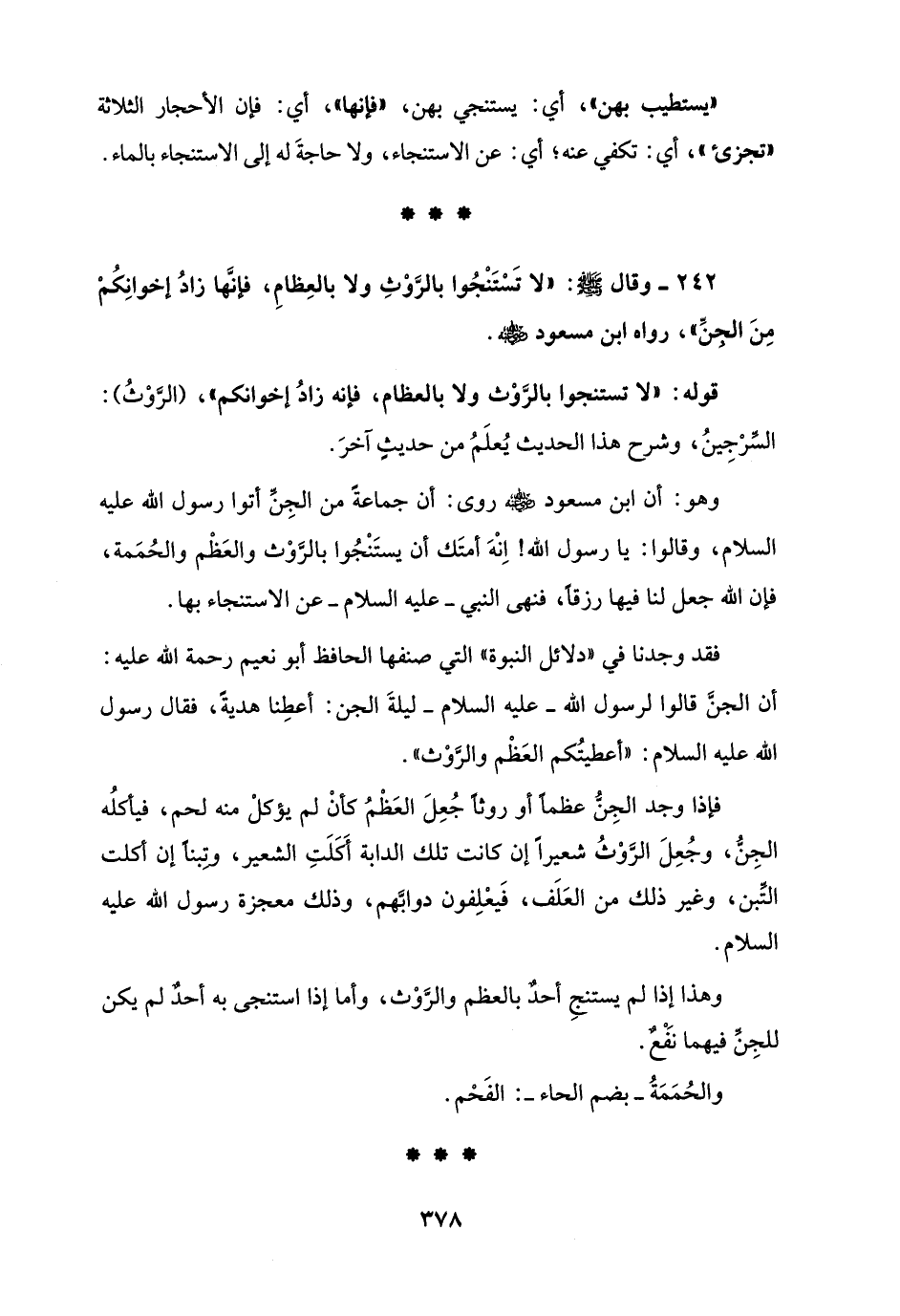 242 - وقال - صلى الله عليه وسلم -: "لا تَسْتَنْجُوا بالرَّوْثِ ولا بالعِظامِ، فإنَّها زادُ إخوانِكُمْ مِنَ الجنِّ"، رواه ابن مسعود - رضي الله عنه -.
