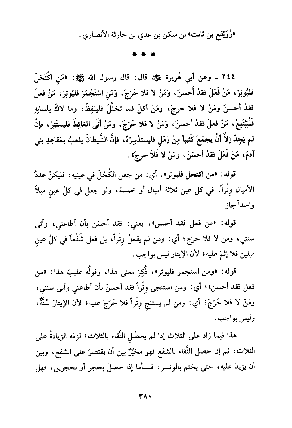 244 - وعن أبي هُريرة - رضي الله عنه - قال: قال رسول الله - صلى الله عليه وسلم -: "مَنِ اكْتَحَلَ فليُوْتِرْ، مَنْ فَعَلَ فقدْ أَحسنَ، وَمَنْ لا فلا حَرَجَ، وَمَنِ اسْتَجْمَرَ فليُوتِرْ، مَنْ فعلَ فقدْ أحسنَ ومَنْ لا فلا حرجَ، ومَنْ أكلَ فما تخلَّلَ فليلفِظْ، وما لاكَ بلسانِهِ فَلْيَبْتَلِعْ، مَنْ فعلَ فقدْ أحسنَ، وَمَنْ لا فلا حَرَجَ، ومَنْ أتَى الغائِطَ فليستَتِرْ، فإنْ لم يَجِدْ إلَّا أنْ يجمَعَ كَثيبًا مِنْ رَمْلٍ فليستدْبِرْهُ، فإنَّ الشَّيطانَ يلعبُ بمَقاعِدِ بني آدمَ، مَنْ فَعَلَ فقدْ أحسَنَ، ومَنْ لا فَلَا حرجَ".