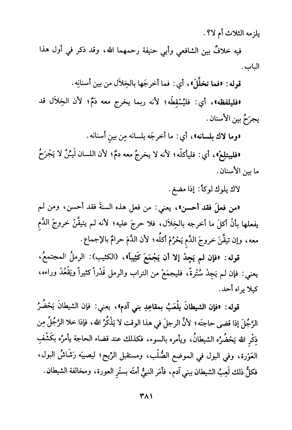 قوله: "فإن الشيطانَ يلْعَبُ بمقاعِدِ بني آدم"، يعني: فإن الشيطانَ يَحْضُرُ الرَّجُلَ إذا قضى حاجتَه؛ لأنَّ الرجلَ في هذا الوقت لا يَذْكُرُ الله، فإذا خلا الرَّجُلُ مِن ذِكْرِ الله يَحْضُرُه الشيطانُ، ويأمره بالسوء، فكذلك عند قضاء الحاجة يأمرُه بكَشفِ العَوْرة، وفي البول في الموضع الصُّلْب، ومستقبل الرِّيح؛ ليصيبَه رَشَاشُ البول، فكلُّ ذلك لَعِبُ الشيطان ببني آدم، فأمَر النبيُّ أمتَه بستْرِ العورة، ومخالفة الشيطان.