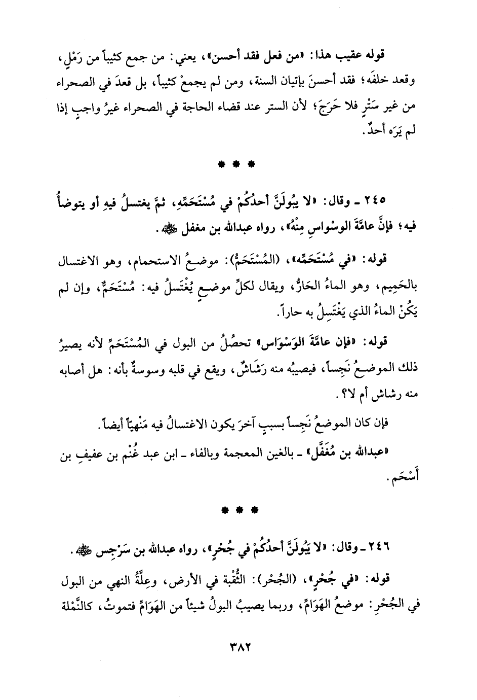 245 - وقال: "لا يبُولَنَّ أحدُكُمْ في مُسْتَحَمِّهِ، ثمَّ يغتسلُ فيهِ أو يتوضأُ فيه؛ فإن عامَّةَ الوسْواسِ مِنْهُ"، رواه عبد الله بن مغفل - رضي الله عنه -.