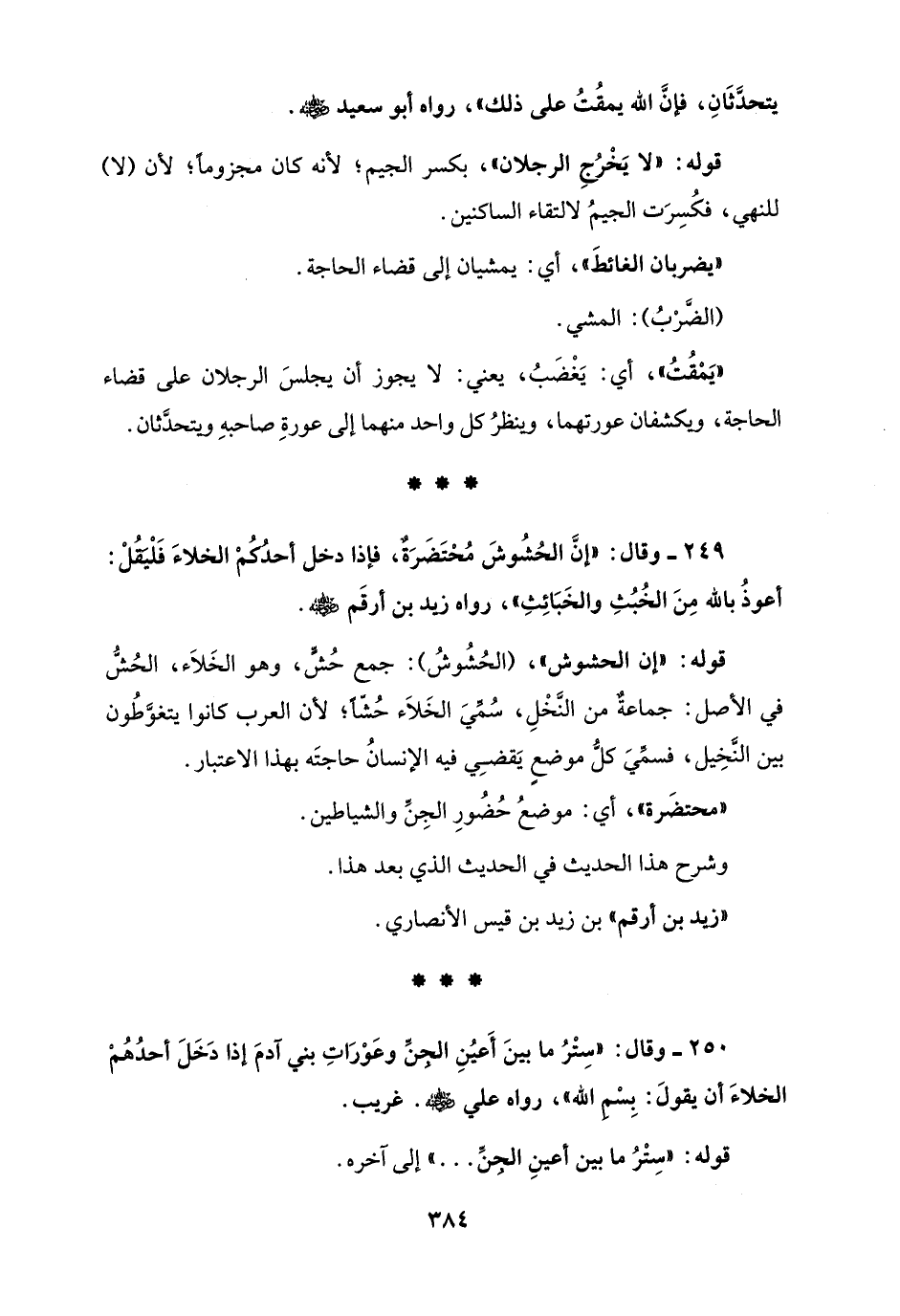 249 - وقال: "إنَّ الحُشُوشَ مُحْتَضَرَةٌ، فإذا دخل أحدُكُمْ الخلاءَ فَلْيَقُلْ: أعوذُ بالله مِنَ الخُبُثِ والخَبَائِثِ"، رواه زيد بن أرقَم - رضي الله عنه -.