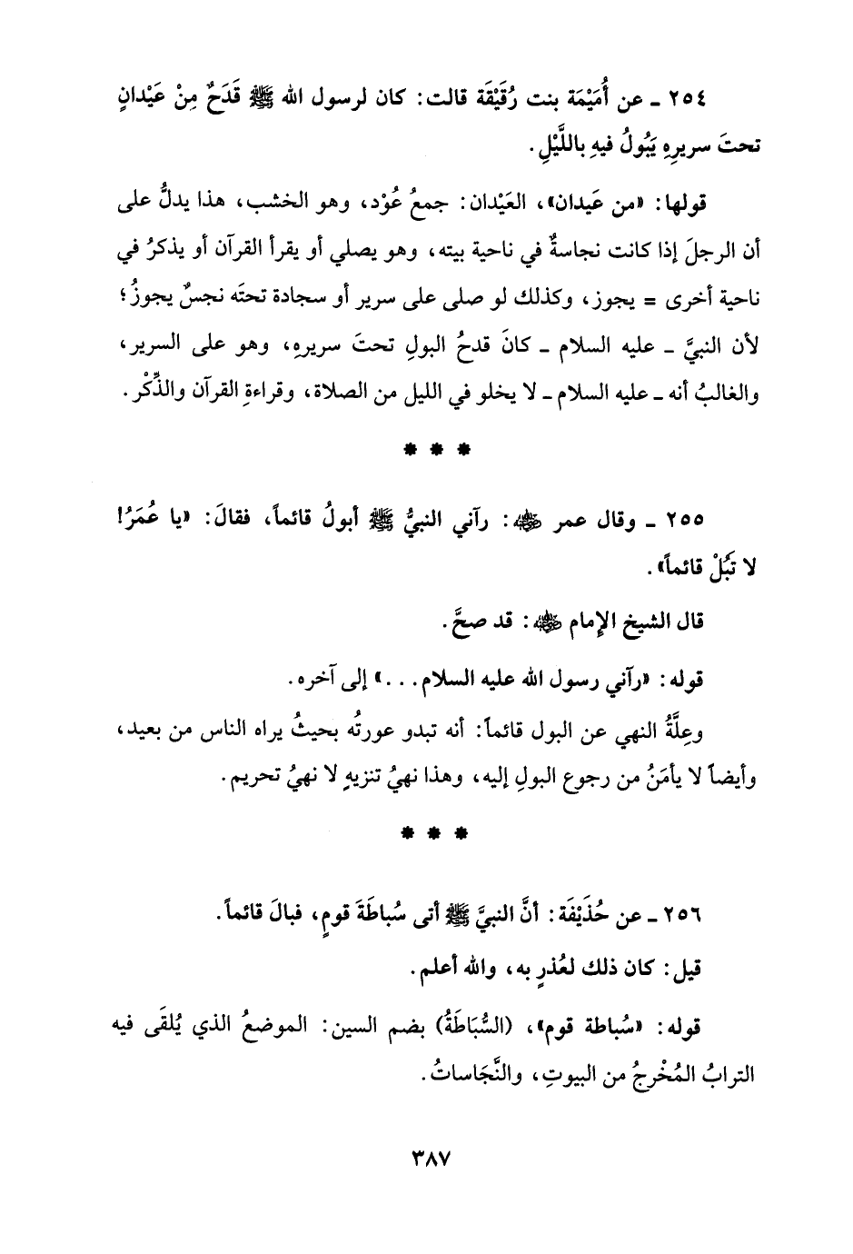 254 - عن أُمَيْمَة بنت رُقَيْقَة قالت: كان لرسول الله - صلى الله عليه وسلم - قَدَحٌ مِنْ عَيْدانٍ تحتَ سريرِهِ يَبُولُ فيهِ باللَّيْلِ.