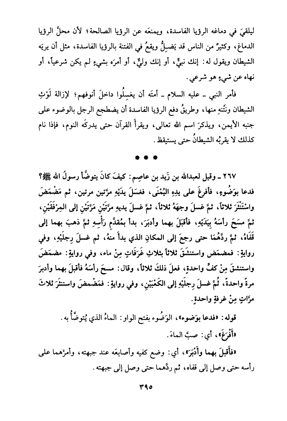 267 - وقيل لعبد الله بن زَيد بن عاصِم: كيفَ كانَ يتوضَّأ رسولُ الله - صلى الله عليه وسلم -؟ فدعا بوَضُوءٍ، فأفرغَ على يدِهِ اليُمْنَى، فغسَلَ يدَيْهِ مرَّتين مرتين، ثم مَضْمَضَ واسْتَنْثَرَ ثلاثًا، ثمَّ غَسلَ وجهَهُ ثلاثًا، ثمَّ غَسلَ يديهِ مرَّتَيْنِ مَرَّتَيْنِ إلى المِرْفَقَيْنِ، ثمَّ مسَحَ رأسَهُ بِيَدَيْهِ، فأقبَلَ بهما وأدبَرَ، بدأ بمُقدَّمِ رَأْسِهِ ثمَّ ذهبَ بهما إلى قَفَاهُ، ثمَّ ردَّهُمَا حتى رجعَ إلى المكانِ الذي بدأَ منهُ، ثم غَسلَ رِجلَيْهِ، وفي روايةٍ: فمضمَض واستنشَقَ ثلاثًا بثلاثِ غَرَفَاتٍ مِنْ ماء، وفي روايةٍ: مضمَضَ واستنشقَ مِنْ كفٍّ واحدةٍ، فعلَ ذلكَ ثلاثًا، وقال: مسحَ رأسَهُ فأقبلَ بهما وأدبرَ مرةً واحدةً، ثُمَّ غَسلَ رِجلَيْهِ إلى الكَعْبَيْنِ، وفي روايةٍ: فمَضْمضَ واسْتَنْثَرَ ثلاثَ مرَّاتٍ مِنْ غرفةٍ واحدةٍ.