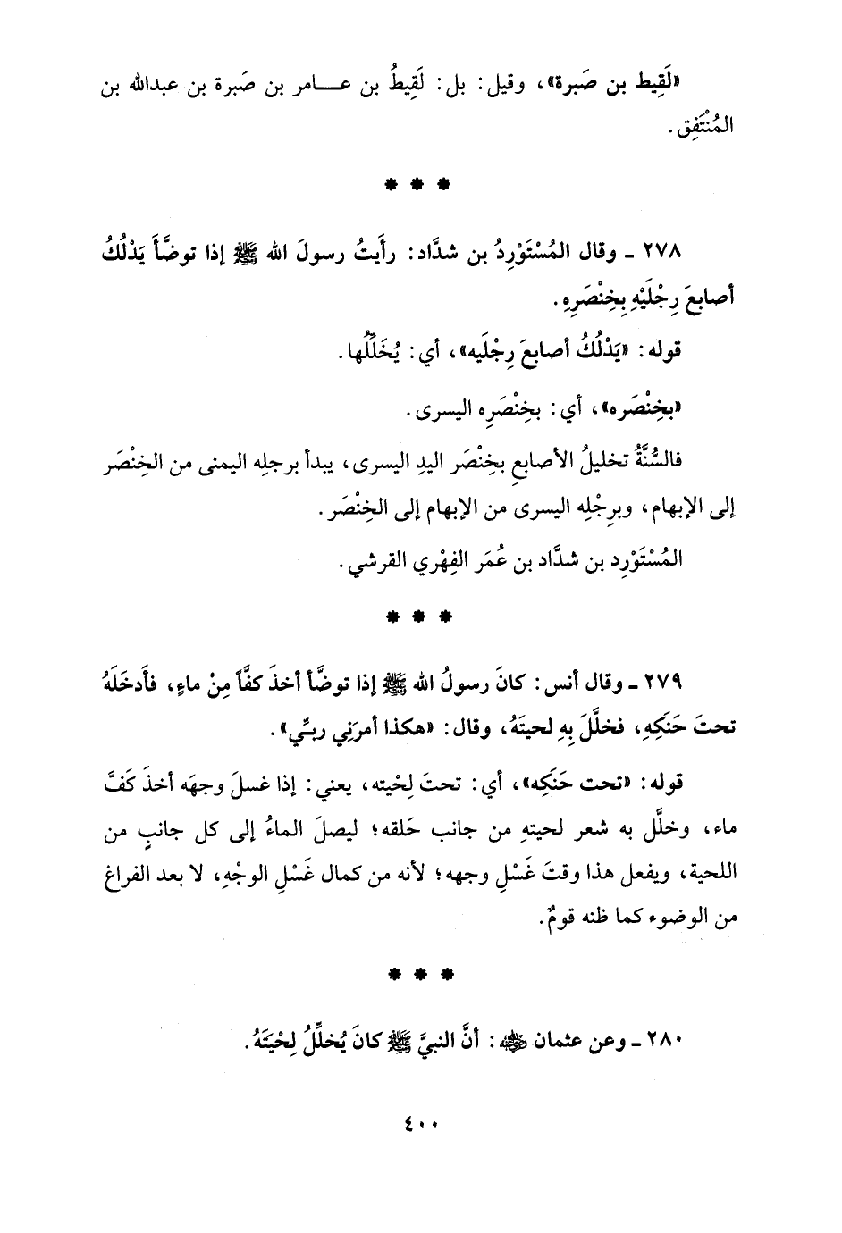 278 - وقال المُسْتَوْرِدُ بن شدَّاد: رأَيتُ رسولَ الله - صلى الله عليه وسلم - إذا توضَّأَ يَدْلُكُ أصابعَ رِجْلَيْهِ بِخِنْصَرِهِ.