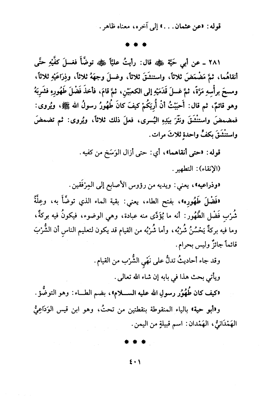 281 - عن أبي حَيَّة - رضي الله عنه - قال: رأيتُ عليًّا - رضي الله عنه - توضَّأَ فغسلَ كفَّيْهِ حتَّى أنقاهُما، ثمَّ مَضْمَضَ ثلاثًا، واستنشَقَ ثلاثًا، وغسلَ وجهَهُ ثلاثًا، وذِرَاعَيْهِ ثلاثًا، ومسحَ برأْسِهِ مَرَّةً، ثمَّ غسلَ قَدَمَيْهِ إلى الكعبَيْنِ، ثمَّ قامَ، فأخذَ فَضْلَ طَهُورِهِ فشَرِبَهُ وهو قائمٌ، ثم قال: أَحبَبْتُ أنْ أُرِيَكُمْ كيفَ كانَ طُهُورُ رسولُ الله - صلى الله عليه وسلم -، ويُروى: فمضمضَ واستنْشَقَ ونَثَرَ بيَدِهِ اليُسرى، فعلَ ذلك ثلاثًا، ويُروى: ثم تضمضَ واستنْشَقَ بكفٍّ واحدةٍ ثلاثَ مرات.
