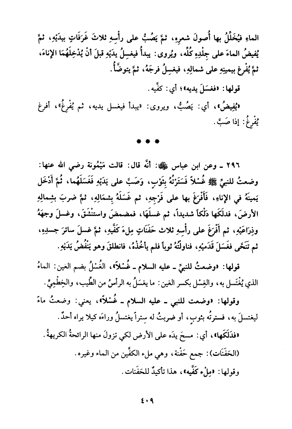 296 - وعن ابن عباس - رضي الله عنهما -: أنَّه قال: قالت مَيْمُونة رضي الله عنها: وضعتُ للنبيِّ - صلى الله عليه وسلم - غُسْلًا فَسَتَرْتُهُ بِثَوْبٍ، وَصَبَّ على يَدَيْهِ فَغَسَلَهُما، ثُمَّ أَدْخَل يَمينَهُ في الإِناءِ، فَأَفْرَغَ بها على فَرْجِهِ، ثم غَسَلَهُ بِشمَالِهِ، ثمَّ ضربَ بشِمالِهِ الأرضَ، فدلَكَها دَلْكًا شديدًا، ثم غسلَهَا، فمضمضَ واستنْشَقَ، وغسلَ وجهَهُ وذِرَاعَيْهِ، ثم أَفْرَغَ على رأْسِهِ ثلاث حَفَنَاتٍ مِلءَ كَفَّيهِ، ثمَّ غسلَ سائرَ جسدِهِ، ثم تَنَحَّى فغَسَلَ قَدَميْهِ، فناولْتُهُ ثوبًا فلم يأخُذْهُ، فانطلقَ وهو يَنْفُضُ يَدَيْهِ.
