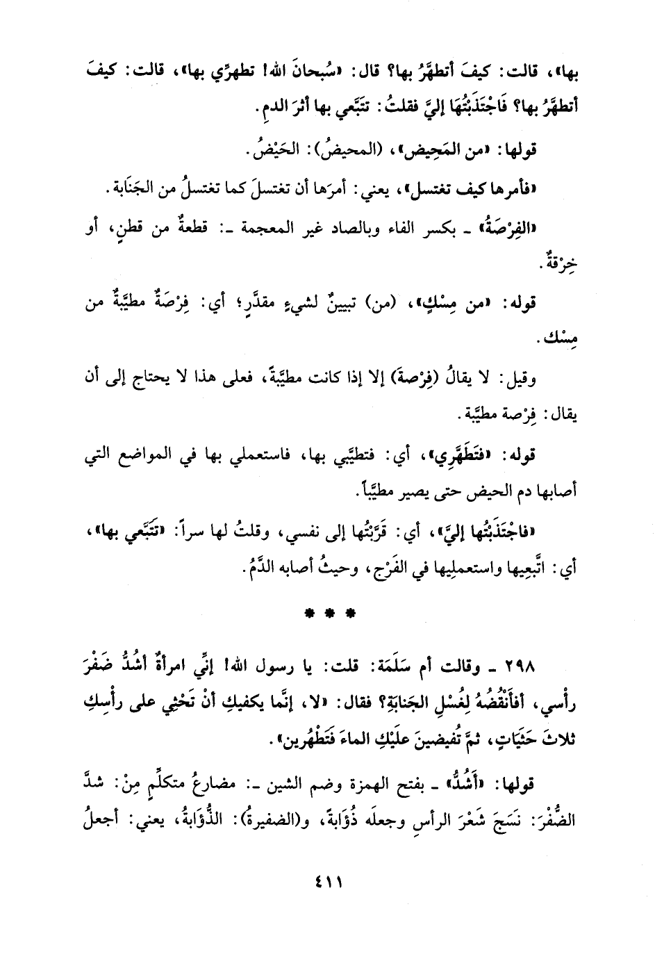298 - وقالت أم سَلَمَة: قلت: يا رسول الله! إنِّي امرأةٌ أشُدُّ ضَفْرَ رأْسي، أفأَنْقُضُهُ لِغُسْلِ الجَنابَةِ؟ فقال: "لا، إنَّما يكفيكِ أنْ تَحْثِي على رأْسِكِ ثلاثَ حَثَيَاتٍ، ثمَّ تُفيضينَ علَيْكِ الماءَ فَتَطْهُرين".