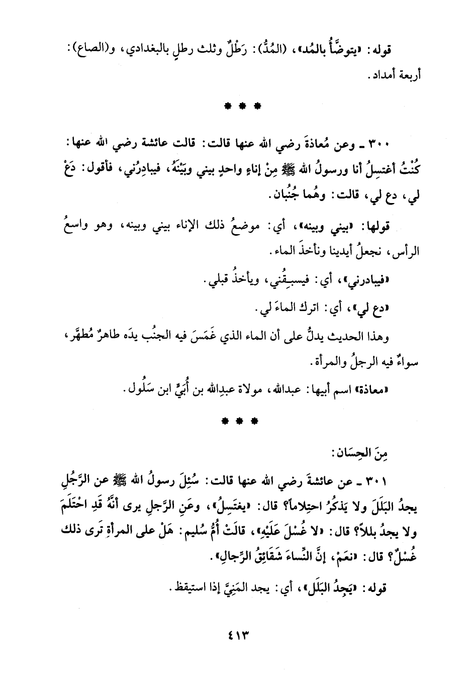 300 - وعن مُعاذةَ رضي الله عنها قالت: قالت عائشة رضي الله عنها: كُنْتُ أغتسِلُ أنا ورسولُ الله - صلى الله عليه وسلم - مِنْ إناءٍ واحدٍ بيني وبَيْنَهُ، فيبادِرُني، فأقول: دَعْ لي، دع لي، قالت: وهُما جُنُبان.