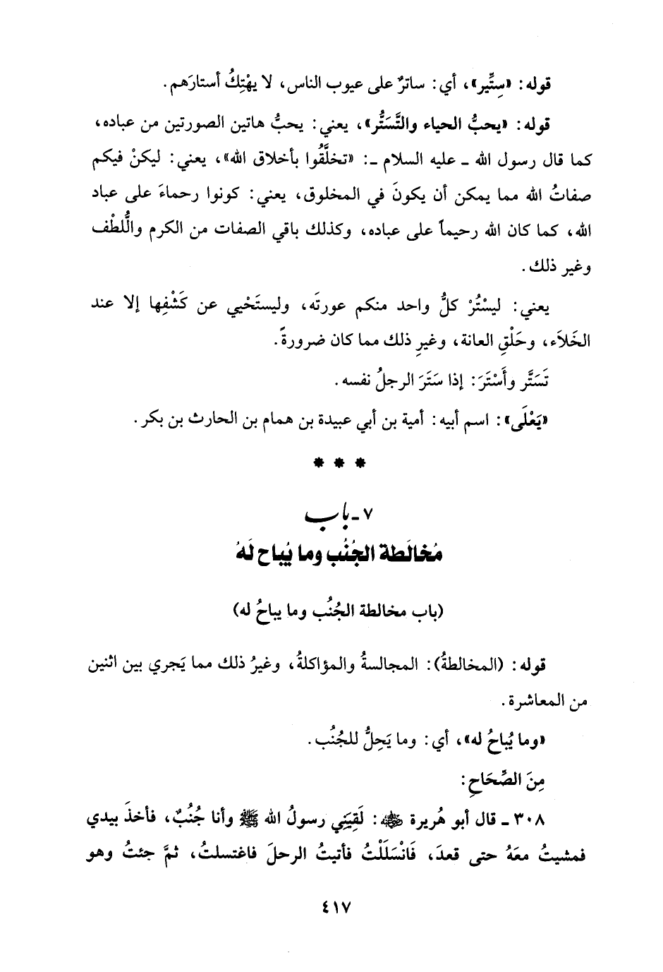 308 - قال أبو هُريرة - رضي الله عنه -: لَقِيَنِي رسولُ الله - صلى الله عليه وسلم - وأنا جُنُبٌ، فأخذَ بيدي فمشيتُ معَهُ حتى قعدَ، فَانْسَلَلْتُ فأتيتُ الرحلَ فاغتسلتُ، ثمَّ جئتُ وهو
