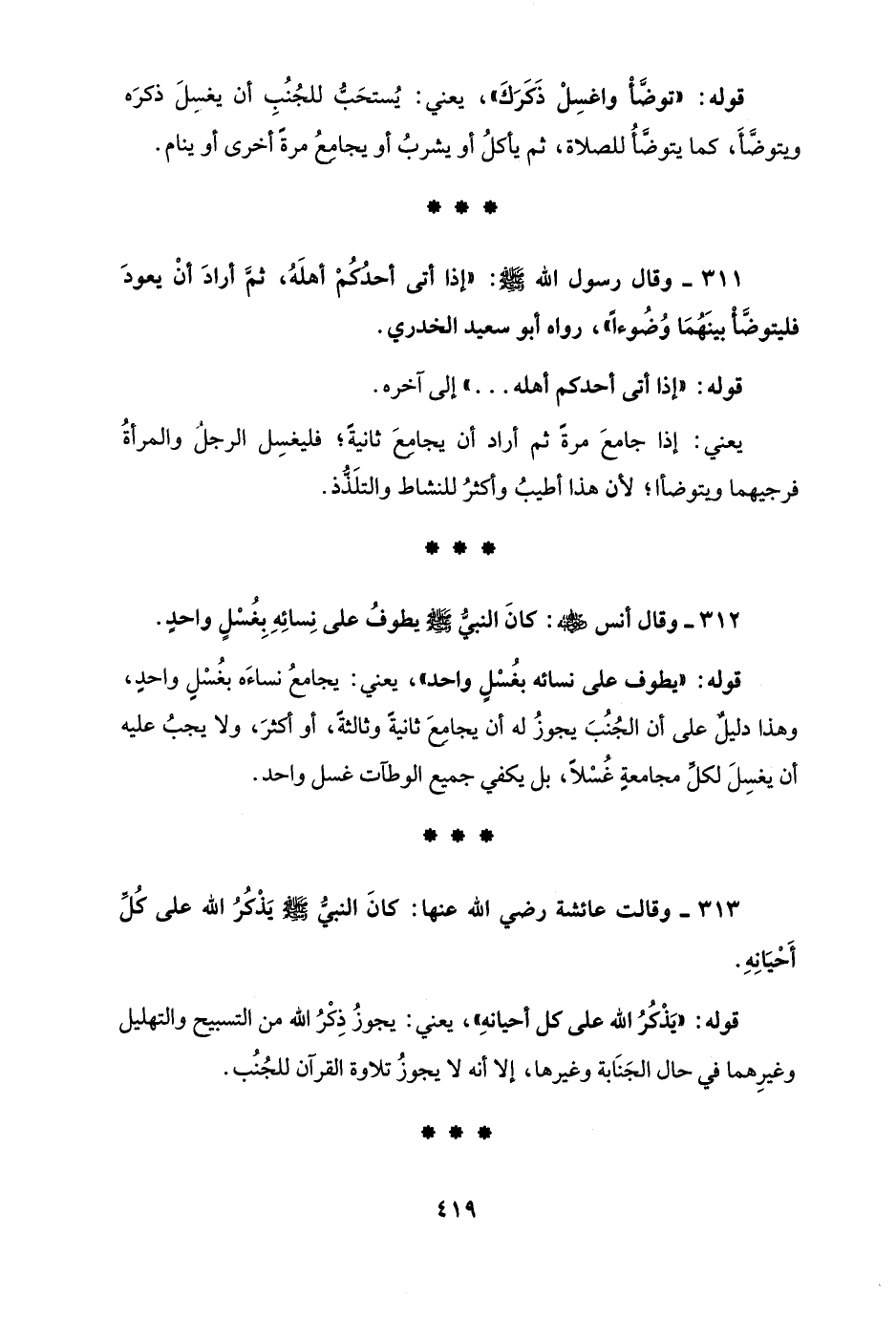 312 - وقال أنس - رضي الله عنه -: كانَ النبيُّ - صلى الله عليه وسلم - يطوفُ على نِسائِهِ بِغُسْلٍ واحدٍ".