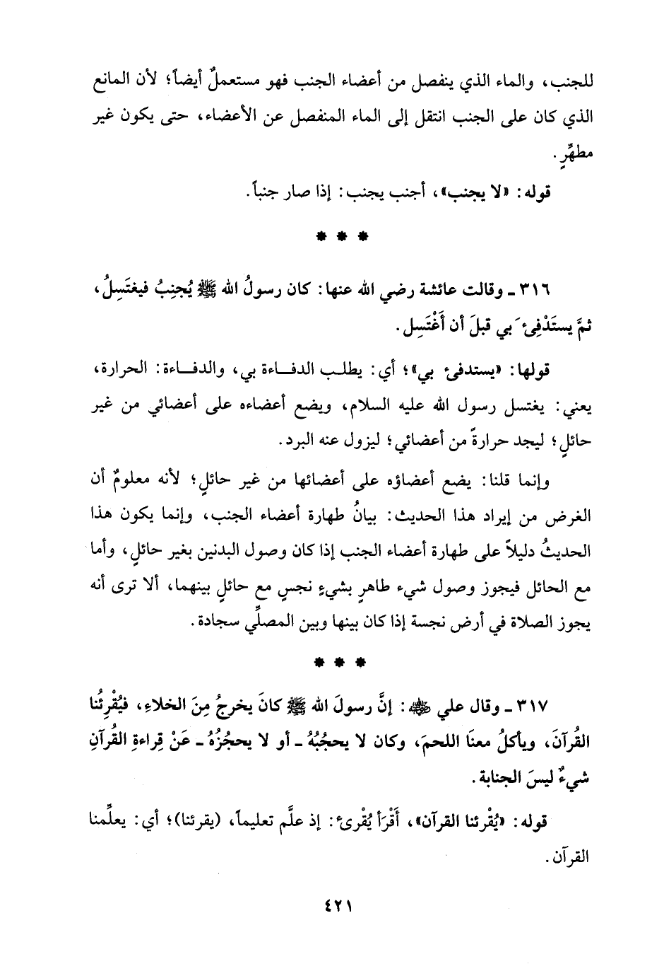 317 - وقال علي - رضي الله عنه -: إنَّ رسولَ الله - صلى الله عليه وسلم - كانَ يخرجُ مِنَ الخلاءِ، فيُقْرِئُنا القُرآنَ، ويأكلُ معنَا اللحمَ، وكان لا يحجُبُهُ - أو لا يحجُزُهُ - عَنْ قِراءةِ القُرآنِ شيءٌ وليسَ الجنابة.