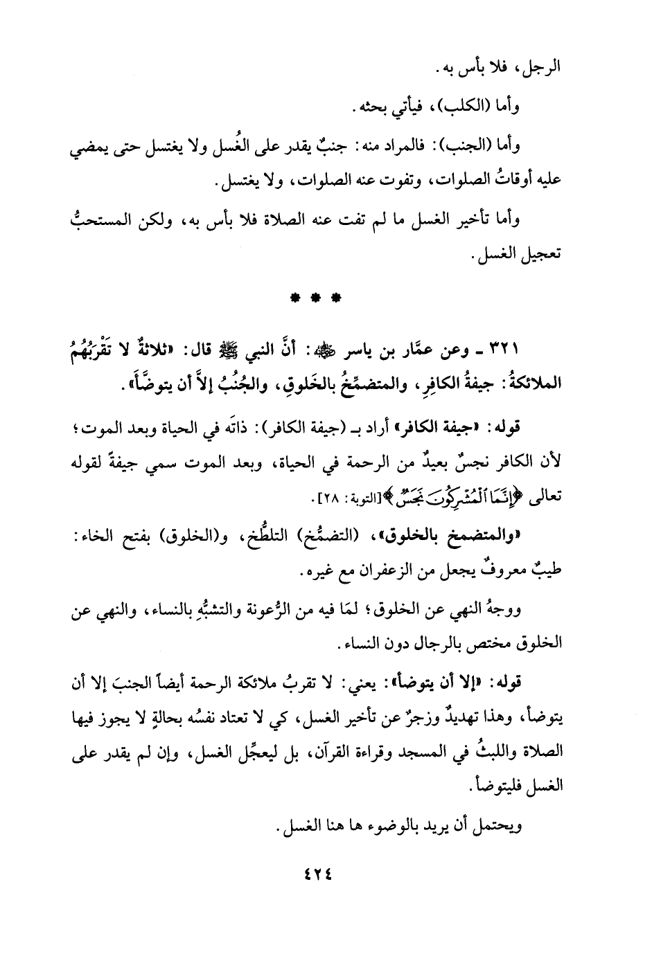 321 - وعن عمَّار بن ياسر - رضي الله عنه -: أنَّ النبي - صلى الله عليه وسلم - قال: "ثلاثةٌ لا تَقْرَبُهُمُ الملائكةُ: جيفةُ الكافِرِ، والمتضمِّخُ بالخَلوقِ، والجُنُبُ إلاَّ أن يتوضَّأَ".