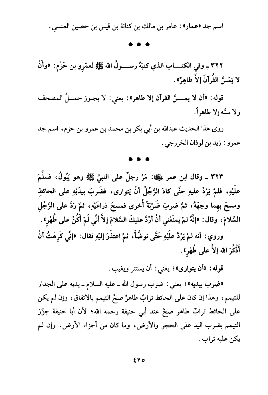 322 - وفي الكتاب الذي كتبَهُ رسولُ الله - صلى الله عليه وسلم - لعمْرِو بن حَزْم: "وأَنْ لا يَمَسَّ القُرآنَ إلاَّ طاهِرٌ".