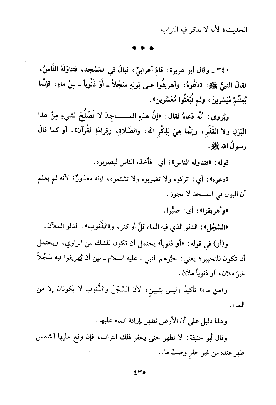 340 - وقال أبو هريرة: قامَ أعرابيٌ، فبالَ في المَسْجد، فتناوَلَهُ النَّاسُ، فقالَ النبيُّ - صلى الله عليه وسلم -: "دَعُوهُ، وأهريقُوا على بَولِهِ سَجْلًا - أَوْ ذَنُوبًا - مِنْ ماءٍ، فإنَّما بُعِثْتُمْ مُيَسِّرينَ، ولم تُبْعَثُوا مُعَسِّرين".