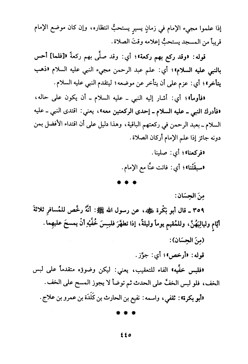 359 - قال أبو بَكْرة - رضي الله عنه -، عن رسول الله - صلى الله عليه وسلم -: أنَّهُ رخَّص للمُسافرِ ثلاثةَ أيَّامٍ وليالِيَهُنَّ، وللمُقيمِ يومًا وليلةً، إذا تطهَّرَ فلبِسَ خُفَّيْهِ أنْ يمسحَ عليهِما.