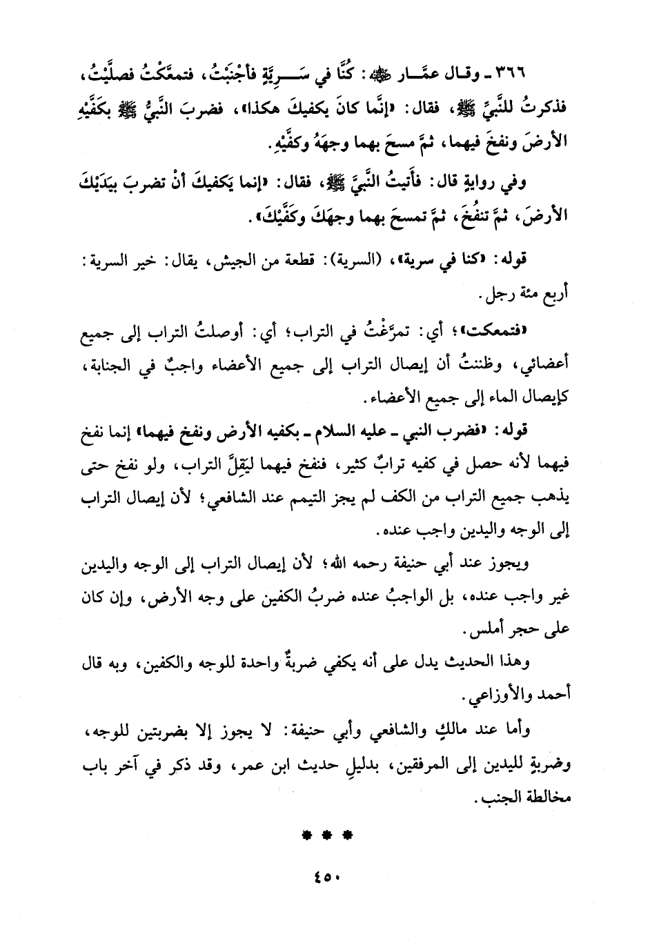 366 - وقال عمَّار - رضي الله عنه -: كُنَّا في سَرِيَّةٍ فأجْنَبْتُ، فتمعَّكْتُ فصلَّيْتُ، فذكرتُ للنَّبيِّ - صلى الله عليه وسلم -، فقال: "إنَّما كانَ يكفيكَ هكذا"، فضربَ النَّبيُّ - صلى الله عليه وسلم - بكَفَّيْهِ الأرضَ ونفخَ فيهما، ثمَّ مسحَ بهما وجهَهُ وكفَّيْهِ.