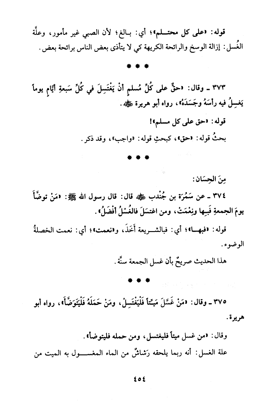 373 - وقال: "حقٌّ على كُلِّ مُسلمٍ أنْ يَغْتَسِلَ في كُلِّ سَبعةِ أيَّامٍ يومًا يَغسِلُ فيه رأسَهُ وجَسَدَهُ"، رواه أبو هريرة - رضي الله عنه -.