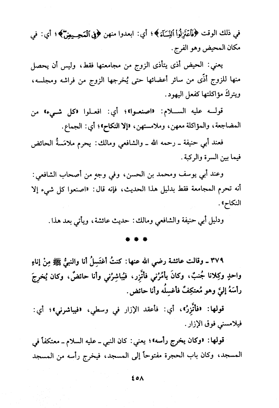 379 - وقالت عائشة رضي الله عنها: كنتُ أغتَسِلُ أنا والنبيُّ - صلى الله عليه وسلم - مِنْ إناءٍ واحدٍ وكِلانا جُنبٌ، وكانَ يأمُرُني فأتَّزِر، فيُباشِرُني وأنا حائضٌ، وكان يُخرِجَ رأسَهُ إليَّ وهو مُعتكِفٌ فأغسِلُه وأنا حائض.