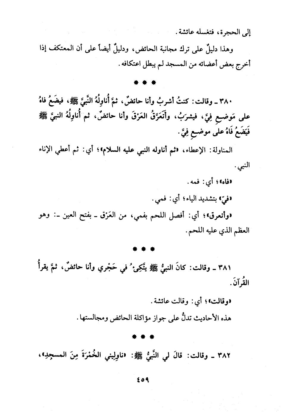 380 - وقالت: كنتُ أشربُ وأنا حائضٌ، ثمَّ أُناوِلُهُ النَّبيَّ - صلى الله عليه وسلم -، فيضَعُ فاهُ على مَوضِعِ فِيَّ، فيشرَبُ، وأَتَعَرَّقُ العَرْقَ وأنا حائضٌ، ثم أُناوِلُهُ النبيَّ - صلى الله عليه وسلم - فَيَضَعُ فَاهُ على موضعِ فِيَّ.