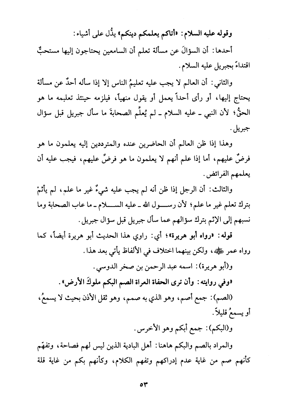 والثاني: أن العالم لا يجب عليه تعليمُ الناس إلا إذا سأله أحدٌ عن مسألة يحتاج إليها، أو رأى أحدًا يعمل أو يقول منهيًا، فيلزمه حينئذ تعليمه ما هو الحقُّ؛ لأن النبي - عليه السلام - لم يُعلِّم الصحابةَ ما سأل جبريل قبل سؤال جبريل.