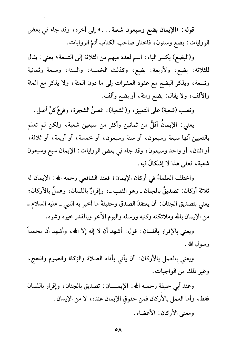 واختلف العلماءُ في أركان الإيمان؛ فعند الشافعي رحمه الله: الإيمان له ثلاثة أركان: تصديقٌ بالجنان - وهو القلب -، وإقرارٌ باللسان، وعملٌ بالأركان؛ يعني بتصديق الجنان: أن يعتقدَ الصدق وحقيقةَ ما أخبر به النبي - عليه السلام - من الإيمان بالله وملائكته وكتبه ورسله واليوم الآخر وبالقدر خيره وشره.