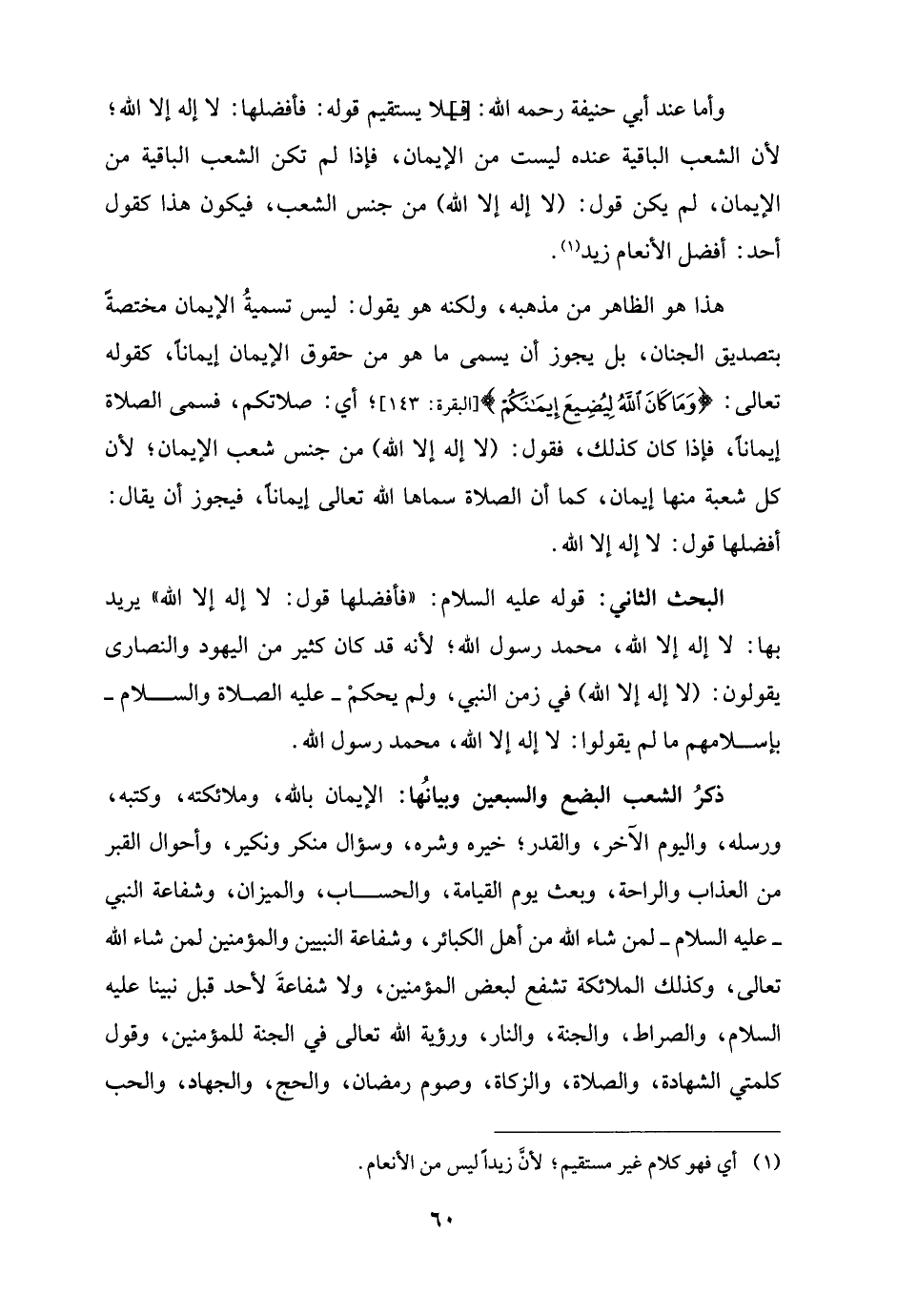 وأما عند أبي حنيفة رحمه الله: [فـ]ــلا يستقيم قوله: فأفضلها: لا إله إلا الله؛ لأن الشعب الباقية عنده ليست من الإيمان، فإذا لم تكن الشعب الباقية من الإيمان، لم يكن قول: (لا إله إلا الله) من جنس الشعب، فيكون هذا كقول أحد: أفضل الأنعام زيد (¬1).
