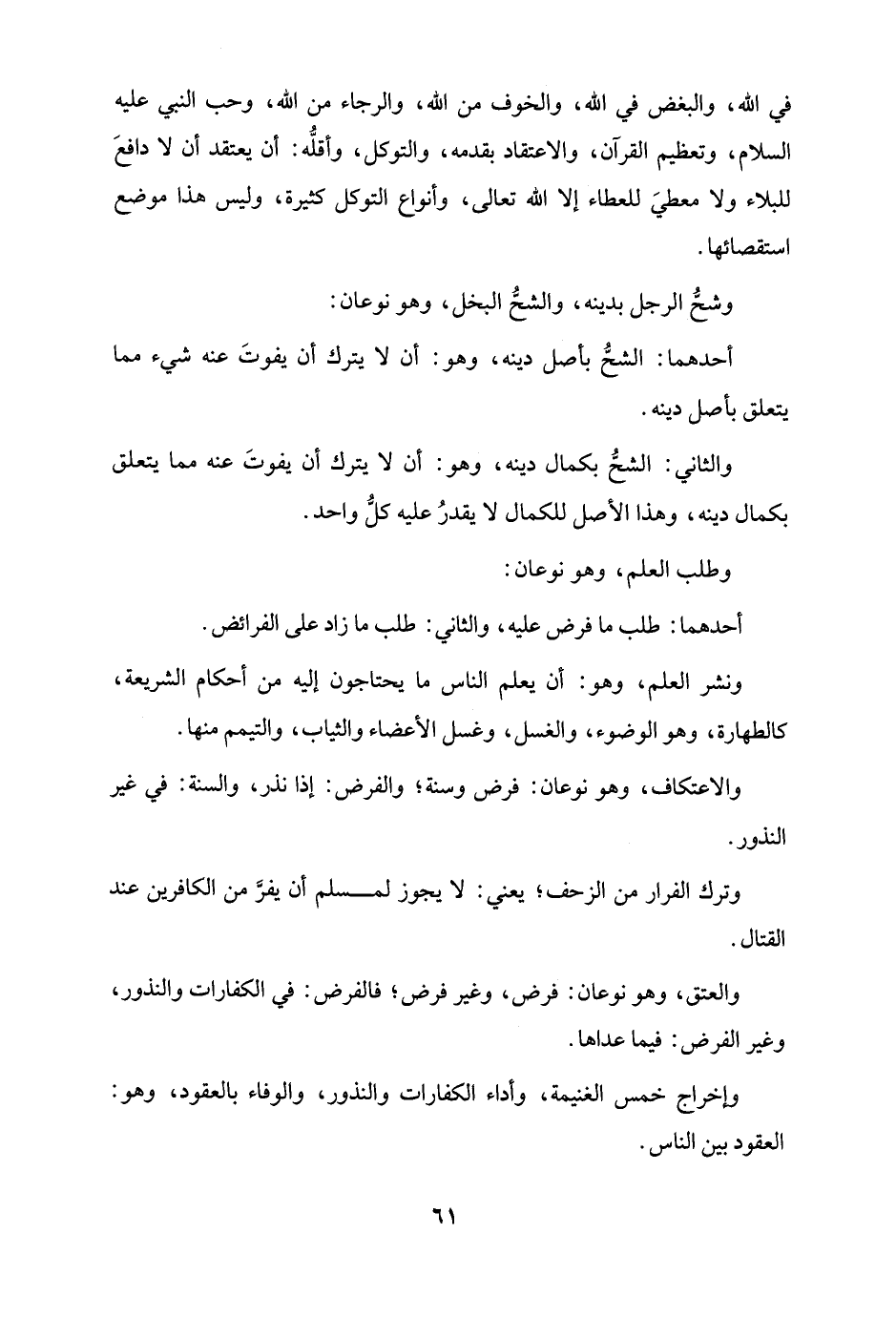 في الله، والبغض في الله، والخوف من الله، والرجاء من الله، وحب النبي عليه السلام، وتعظيم القرآن، والاعتقاد بقدمه، والتوكل، وأقلُّه: أن يعتقد أن لا دافعَ للبلاء ولا معطيَ للعطاء إلا الله تعالى، وأنواع التوكل كثيرة، وليس هذا موضع استقصائها.