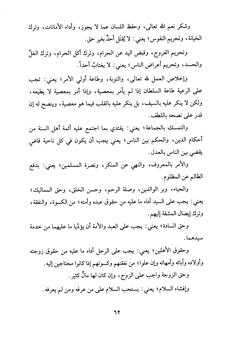 وشكر نعم الله تعالى، وحفظ اللسان عما لا يجوز، وأداء الأمانات، وترك الخيانة، وتحريم النفوس؛ يعني: لا يُقتَل أحدٌ بغير حق.