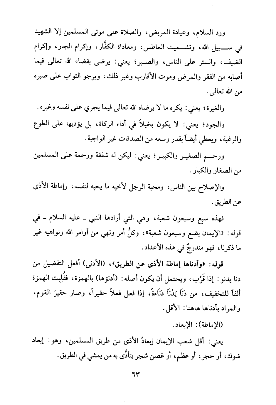 والإصلاح بين الناس، ومحبة الرجل لأخيه ما يحبه لنفسه، وإماطة الأذى عن الطريق.