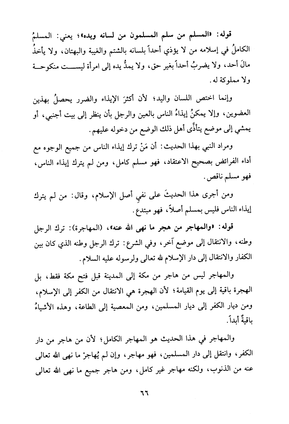 قوله: "المسلم من سلم المسلمون من لسانه ويده"؛ يعني: المسلمُ الكاملُ في إسلامه من لا يؤذي أحدًا بلسانه بالشتم والغيبة والبهتان، ولا يأخذُ مالَ أحد، ولا يضربُ أحدًا بغير حق، ولا يمدُّ يده إلى امرأة ليست منكوحة ولا مملوكة له.
