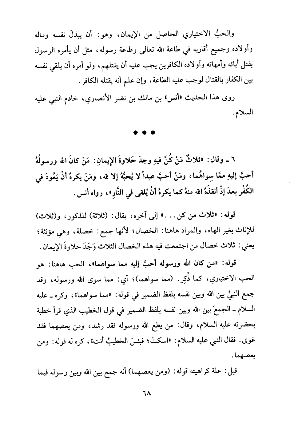 6 - وقال: "ثلاثٌ مَنْ كُنَّ فيهِ وجدَ حَلاوةَ الإيمانِ: مَنْ كانَ الله ورسولُهُ أحبَّ إليهِ ممَّا سِواهُما، ومَنْ أحبَّ عبدًا لا يُحبُّهُ إلا لله، ومَنْ يكرهُ أنْ يَعُودَ في الكُفْر بعدَ إذْ أنقذَهُ الله منهُ كما يكرهُ أنْ يُلقى في النَّارِ"، رواه أنس.