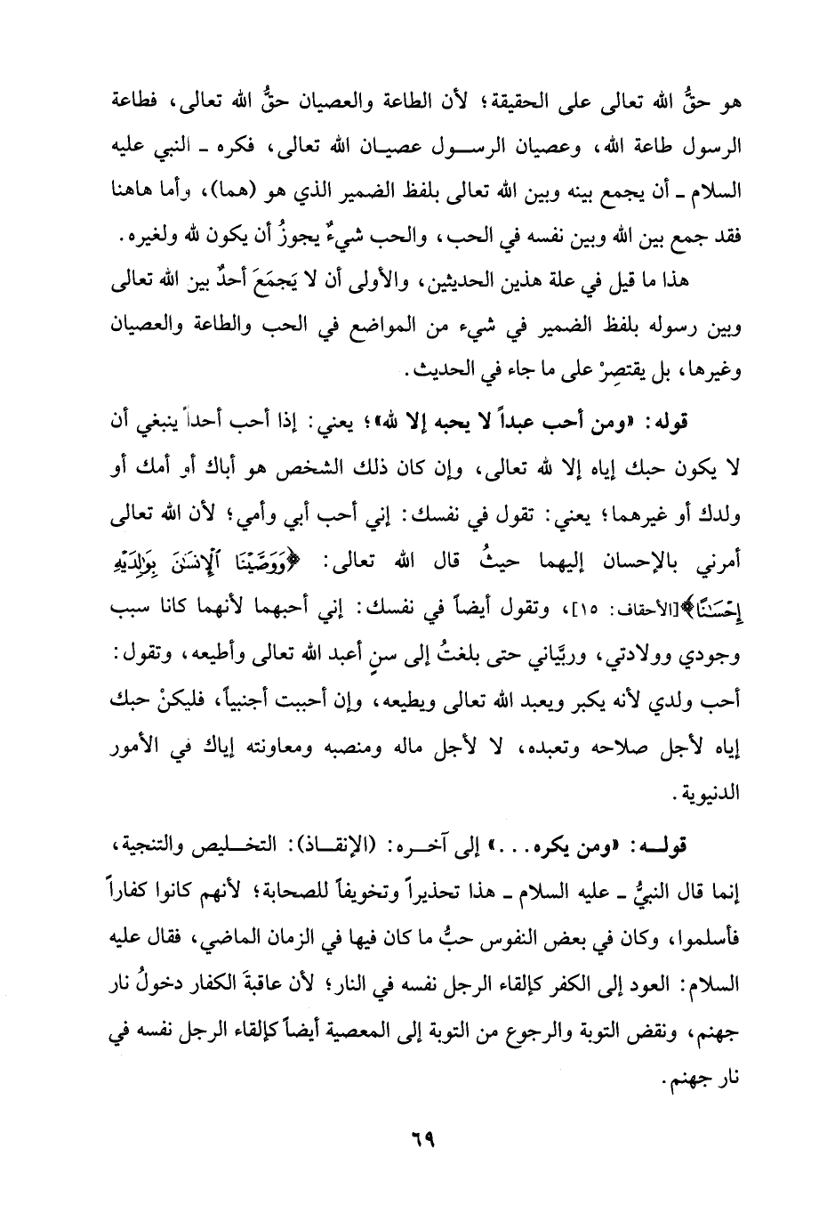 قوله: "ومن أحب عبدًا لا يحبه إلا لله"؛ يعني: إذا أحب أحدًا ينبغي أن لا يكون حبك إياه إلا لله تعالى، وإن كان ذلك الشخص هو أباك أو أمك أو ولدك أو غيرهما؛ يعني: تقول في نفسك: إني أحب أبي وأمي؛ لأن الله تعالى أمرني بالإحسان إليهما حيثُ قال الله تعالى: {وَوَصَّيْنَا الْإِنْسَانَ بِوَالِدَيْهِ إِحْسَانًا} [الأحقاف: 15]، وتقول أيضًا في نفسك: إني أحبهما لأنهما كانا سبب وجودي وولادتي، وربَّياني حتى بلغتُ إلى سنٍ أعبد الله تعالى وأطيعه، وتقول: أحب ولدي لأنه يكبر ويعبد الله تعالى ويطيعه، وإن أحببت أجنبيًا، فليكنْ حبك إياه لأجل صلاحه وتعبده، لا لأجل ماله ومنصبه ومعاونته إياك في الأمور الدنيوية.