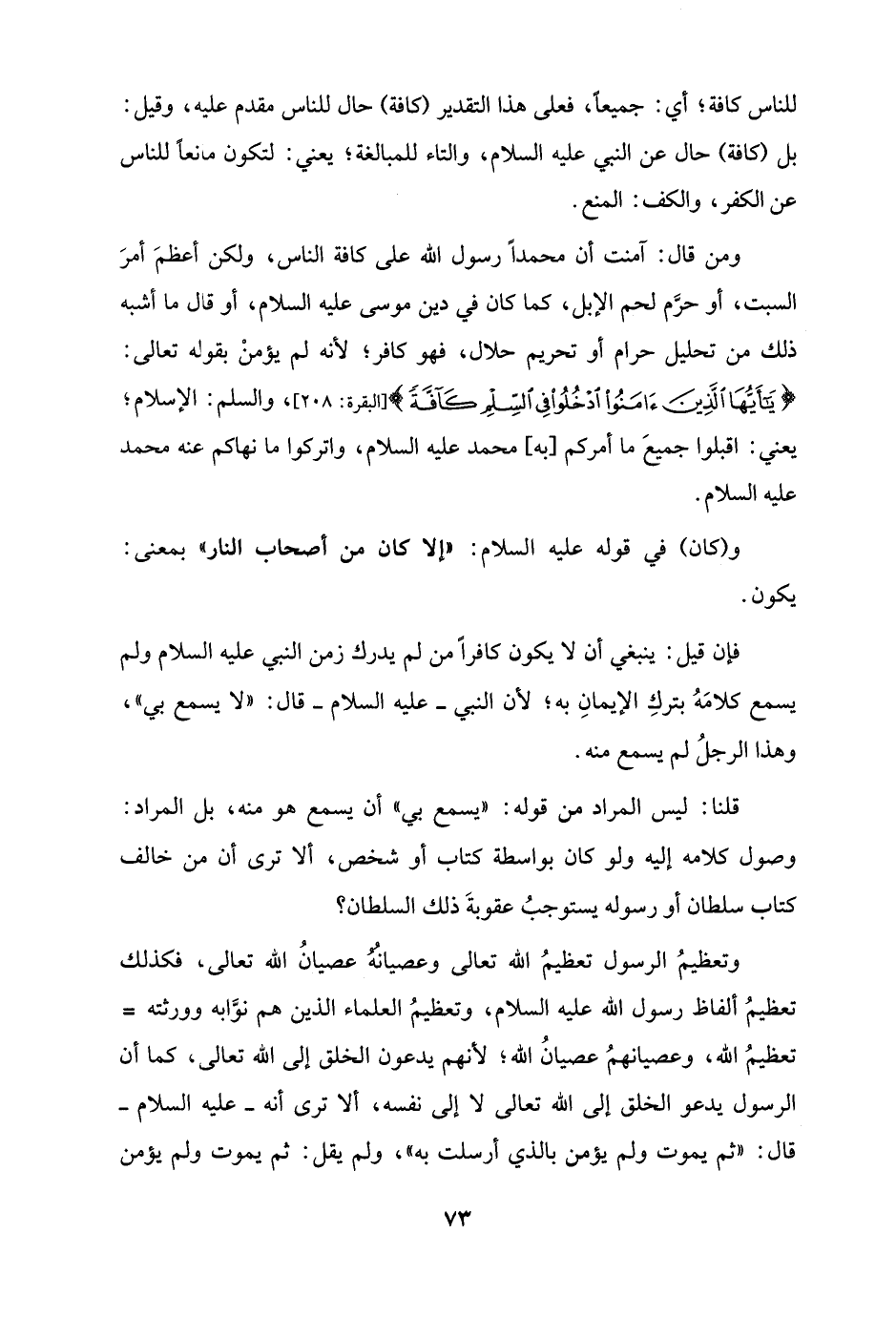 ومن قال: آمنت أن محمدًا رسول الله على كافة الناس، ولكن أعظمَ أمرَ السبت، أو حرَّم لحم الإبل، كما كان في دين موسى عليه السلام، أو قال ما أشبه ذلك من تحليل حرام أو تحريم حلال، فهو كافر؛ لأنه لم يؤمنْ بقوله تعالى: {يَاأَيُّهَا الَّذِينَ آمَنُوا ادْخُلُوا فِي السِّلْمِ كَافَّةً} [البقرة: 208]، والسلم: الإسلام؛ يعني: اقبلوا جميعَ ما أمركم [به] محمد عليه السلام، واتركوا ما نهاكم عنه محمد عليه السلام.