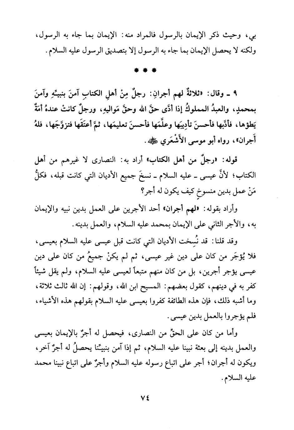 9 - وقال: "ثلاثةٌ لهم أجرانِ: رجلٌ مِنْ أهلِ الكتابِ آمنَ بنبيِّهِ وآمنَ بمحمدٍ، والعبدُ المملوكُ إذا أدَّى حقَّ الله وحقَّ مَواليهِ، ورجلٌ كانتْ عندهُ أمَةٌ يَطؤها، فأدَّبها فاحسنَ تأدِيبَها وعلَّمَها فأحسنَ تعليمَها، ثمَّ أعتَقَها فتزوَّجَها، فلهُ أَجران"، رواه أبو موسى الأَشْعَري - رضي الله عنه -.