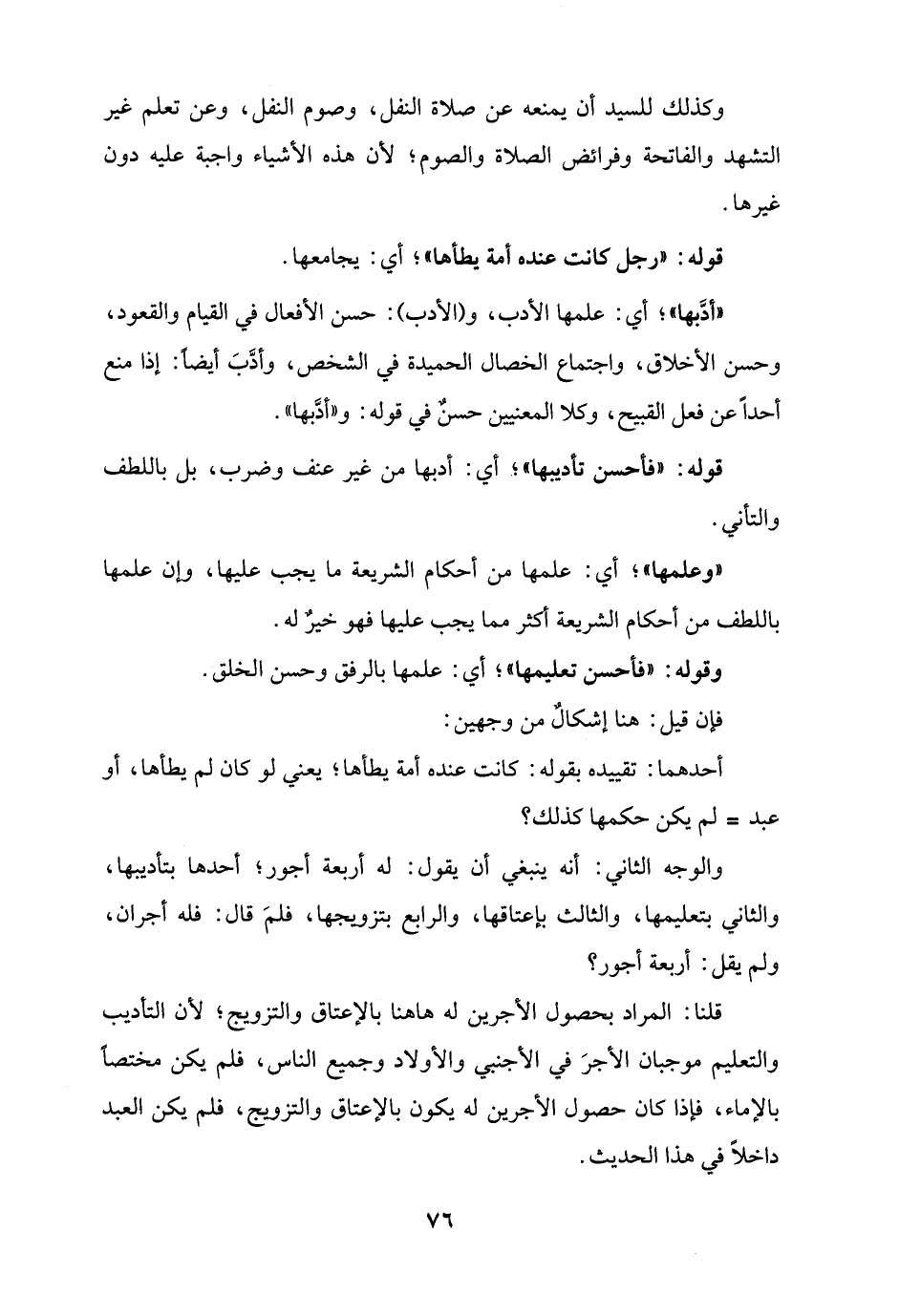 قلنا: المراد بحصول الأجرين له ها هنا بالإعتاق والتزويج؛ لأن التأديب والتعليم موجبان الأجرَ في الأجنبي والأولاد وجميع الناس، فلم يكن مختصًا بالإماء، فإذا كان حصول الأجرين له يكون بالإعتاق والتزويج، فلم يكن العبد داخلًا في هذا الحديث.