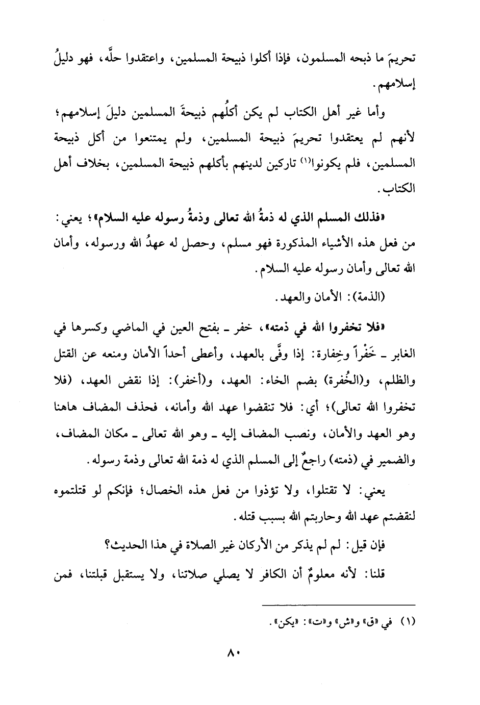 تحريمَ ما ذبحه المسلمون، فإذا أكلوا ذبيحة المسلمين، واعتقدوا حلَّه، فهو دليلُ إسلامهم.