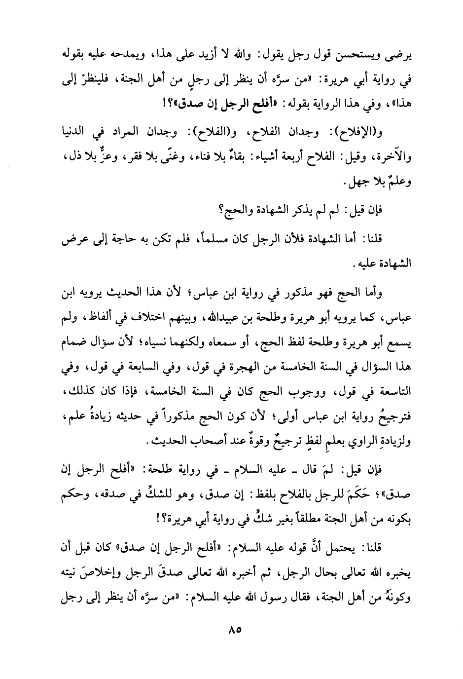 فإن قيل: لمَ قال - عليه السلام - في رواية طلحة: "أفلح الرجل إن صدق"؛ حَكَمَ للرجل بالفلاح بلفظ: إن صدق، وهو للشكِّ في صدقه، وحكم بكونه من أهل الجنة مطلقًا بغير شكًّ في رواية أبي هريرة؟!