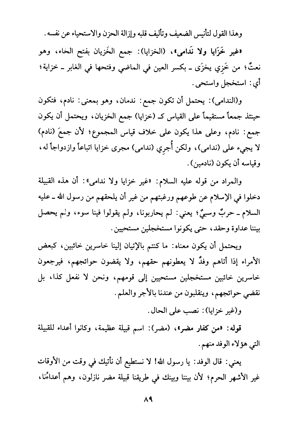 والمراد من قوله عليه السلام: "غير خزايا ولا ندامى": أن هذه القبيلة دخلوا في الإسلام عن طوعهم ورغبتهم من غير أن يلحقهم من رسول الله - عليه السلام - حربٌ وسبيٌ؛ يعني: لم يحاربونا، ولم يقولوا فينا سوء، ولم يحصل بيننا عداوة وحقد، حتى يكونوا مستخجلين مستحيين.