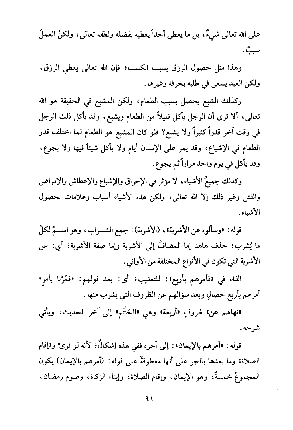 وكذلك الشبع يحصل بسبب الطعام، ولكن المشبع في الحقيقة هو الله تعالى، ألا ترى أن الرجل يأكل قليلًا من الطعام ويشبع، وقد يأكل ذلك الرجل في وقت آخر قدرًا كثيرًا ولا يشبع؟ فلو كان المشبع هو الطعام لما اختلف قدر الطعام في الإشباع، وقد يمر على الإنسان أيام ولا يأكل شيئًا فيها ولا يجوع، وقد يأكل في يوم واحد مرارًا ثم يجوع.
