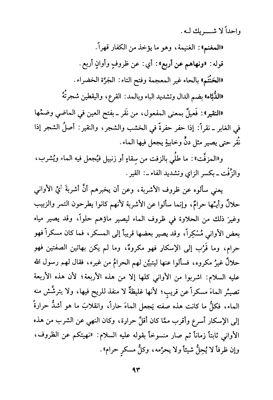 يعني سألوه عن ظروف الأشربة، وعن أن يخبرهم أنَّ أشربةَ أيَّ الأواني حلالٌ وأيِّها حرامٌ، وإنما سألوا عن الأشربة لأنهم كانوا يطرحون التمر والزبيب وغيرَ ذلك من الحلاوة في ظروف الماء ليصير ماؤهم حلوًا، وقد يصير مياه بعض الأواني مُسْكِرًا، وقد يصير بعضها قريبًا إلى المسكر، فما كان مسكرًا فهو حرام، وما قَرُب إلى الإسكار فهو مكروهٌ، وما لم يكن بهاتين الصفتين فهو حلالٌ غيرُ مكروه، فسألوا عنها ليتبيَّن لهم الحرامُ من غيره، فقال لهم رسول الله عليه السلام: اشربوا من الأواني كلها إلا من هذه الأربعة؛ لأن هذه الأربعة تصيَّر الماءَ مسكرًا عن قريبٍ؛ لأنها غليظةٌ لا منفذ للريح فيها، ولا يترشَّش منه الماء، فكلُّ ما كانت هذه صفته يَجعل الماءَ حارًا، وانقلابَ ما هو أشدُّ حرارةً إلى الإسكار أسرع وأقرب ممَّا كان أقلَّ حرارة، وكان النهي عن الشرب من هذه الأواني ثابتًا زمانًا ثم صار منسوخًا بقوله عليه السلام: "نهيتكم عن الظروف، وإن ظرفًا لا يُحِلُّ شيئًا ولا يحرَّمه، وكلُّ مسكرٍ حرام".