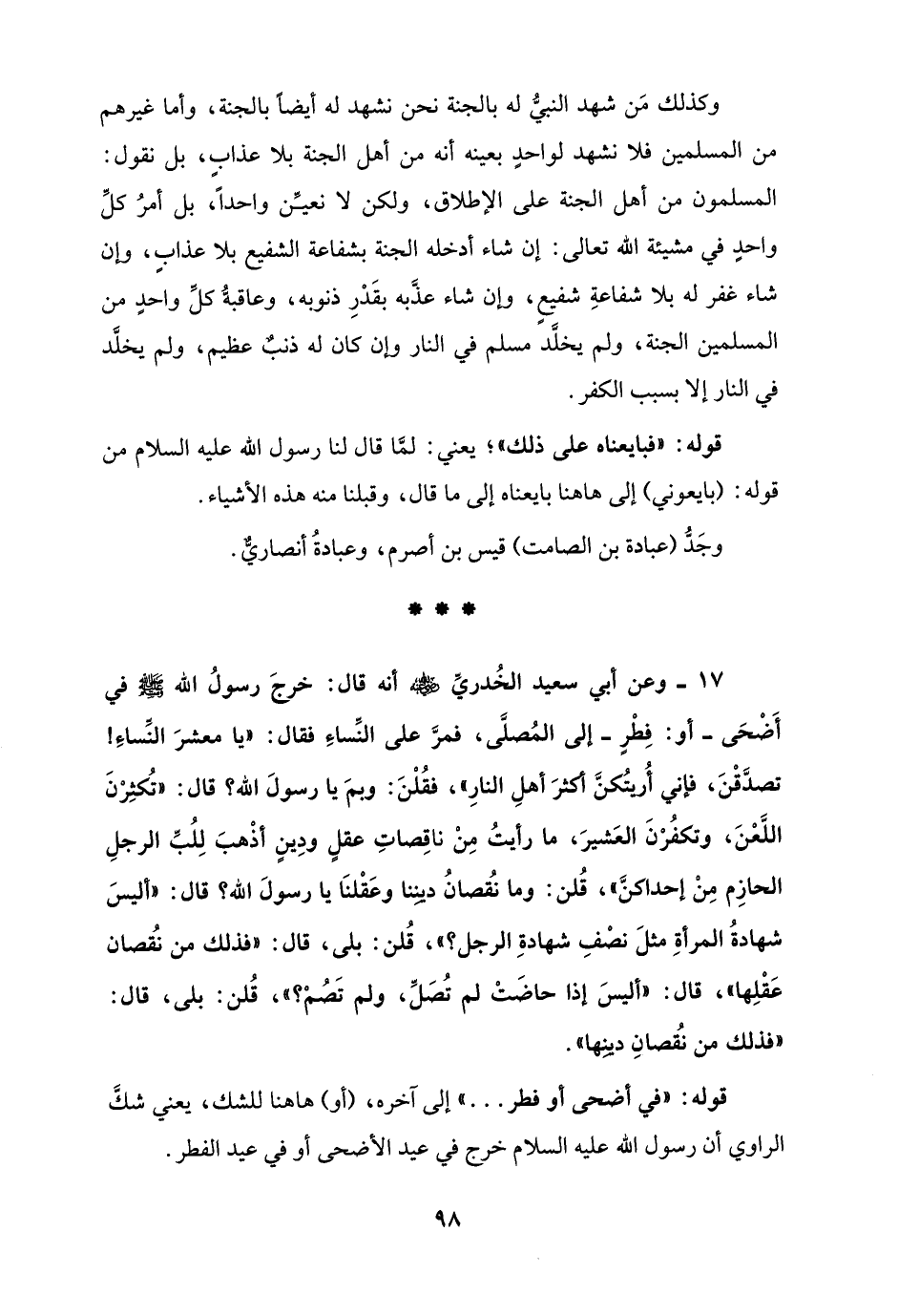 17 - وعن أبي سعيد الخُدريِّ - رضي الله عنه - أنه قال: خرجَ رسولُ الله - صلى الله عليه وسلم - في أَضْحَى - أو: فِطْرٍ - إلى المُصلَّى، فمرَّ على النِّساءِ فقال: "يا معشرَ النِّساءِ! تصدَّقْنَ، فإني أُريتُكنَّ أكثرَ أهلِ النارِ"، فقُلْنَ: وبمَ يا رسولَ الله؟ قال: "تُكثِرْنَ اللَّعْنَ، وتكفُرْنَ العَشيرَ، ما رأيتُ مِنْ ناقِصاتِ عقلٍ ودِينٍ أذْهبَ لِلُبِّ الرجلِ الحازِم مِنْ إحداكنَّ"، قُلن: وما نُقصانُ دينِنا وعَقْلنَا يا رسولَ الله؟ قال: "أليسَ شهادةُ المرأةِ مثلَ نصْفِ شهادةِ الرجل؟ "، قُلن: بلى، قال: "فذلك من نُقصان عَقْلِها"، قال: "أليسَ إذا حاضَتْ لم تُصَلِّ، ولم تَصُمْ؟ "، قُلن: بلى، قال: "فذلك من نُقصانِ دينِها".