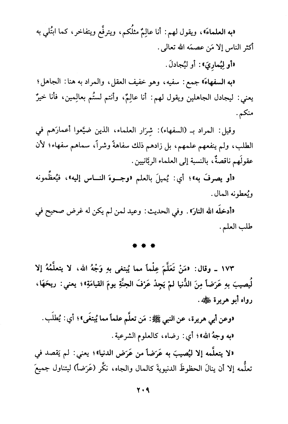 173 - وقال: "مَنْ تَعَلَّمَ عِلْمًا مما يُبتغى بهِ وَجْهُ الله، لا يتعلَّمُهُ إلا لُيصيبَ بهِ عَرَضًا مِنَ الدُّنيا لمْ يَجد عَرفَ الجنةِ يومَ القيامَةِ"؛ يعني: ريحَها، رواه أبو هريرة - رضي الله عنه -.