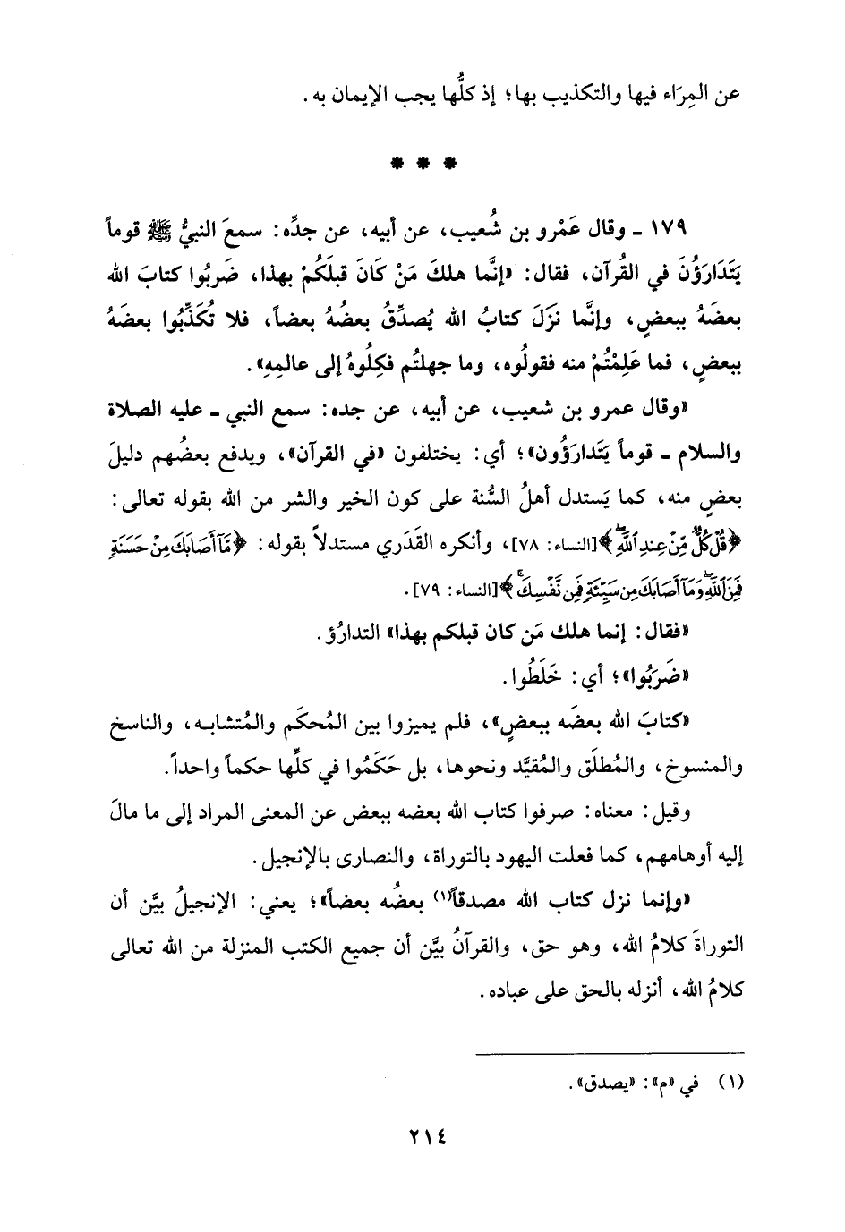 179 - وقال عَمْرو بن شُعيب، عن أبيه، عن جدِّه: سمعَ النبيُّ - صلى الله عليه وسلم - قومًا يَتَدَارَؤُنَ في القُرآن، فقال: "إنَّما هلكَ مَنْ كَانَ قبلَكُمْ بهذا، ضَربُوا كتابَ الله بعضَهُ ببعضٍ، وإنَّما نزَلَ كتابُ الله يُصدِّقُ بعضُهُ بعضًا، فلا تُكَذِّبُوا بعضَهُ ببعضٍ، فما عَلِمْتُمْ منه فقولُوه، وما جهلتُم فكِلُوهُ إلى عالمِهِ".