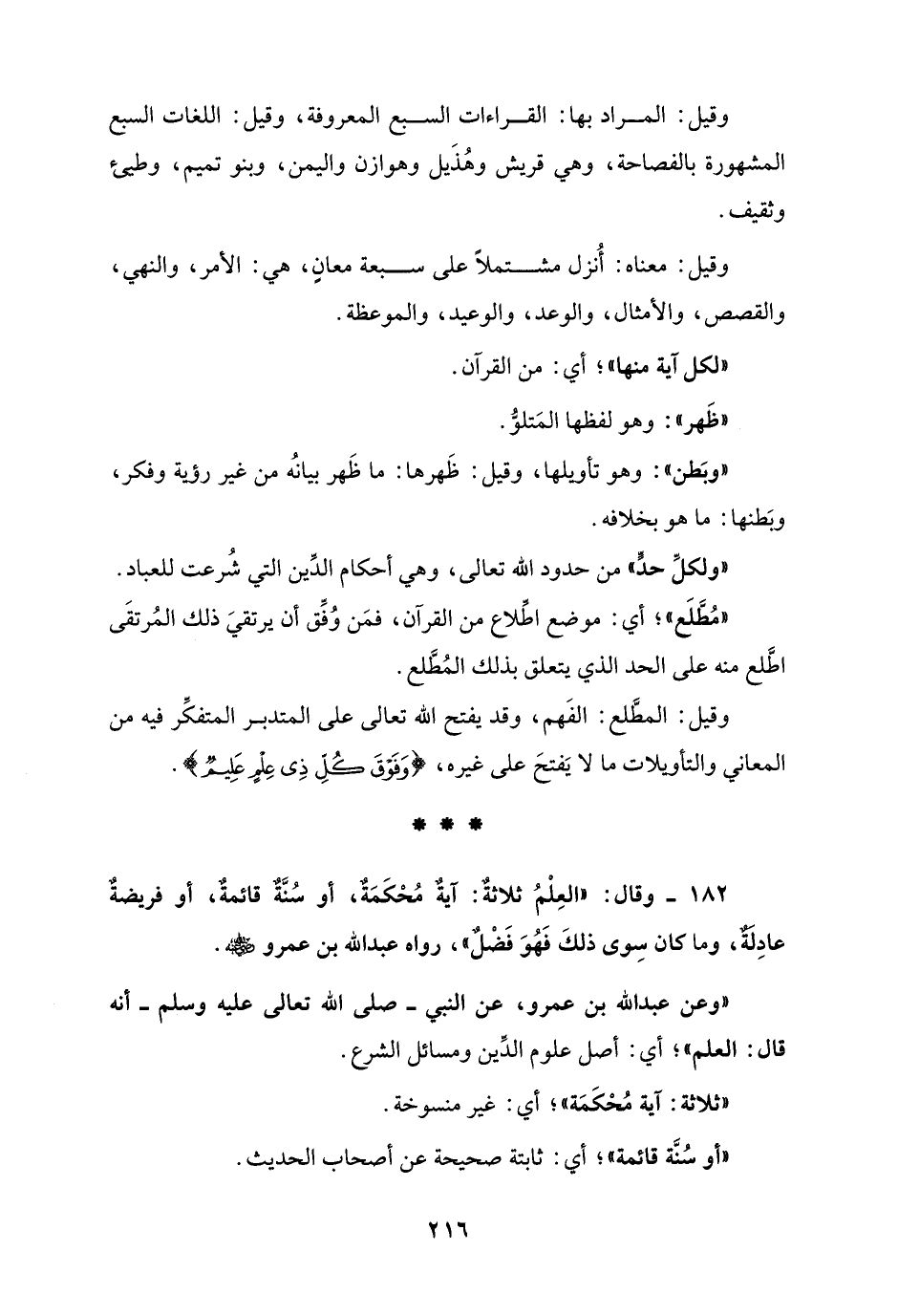 182 - وقال: "العِلْمُ ثلاثةٌ: آيةٌ مُحْكَمَةٌ، أو سُنَّةٌ قائمةٌ، أو فريضةٌ عادِلَةٌ، وما كان سِوى ذلكَ فَهُوَ فَضْلٌ"، رواه عبد الله بن عمرو - رضي الله عنه -.