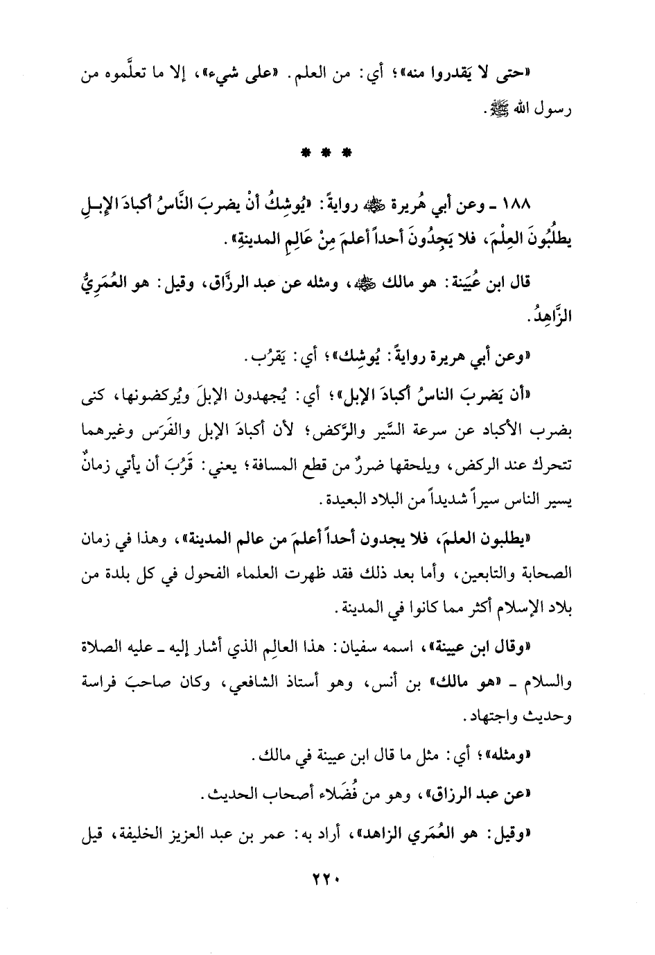188 - وعن أبي هُريرة - رضي الله عنه - روايةً: "يُوشِكُ أنْ يضربَ النَّاسُ أكبادَ الإبلِ يطلُبُونَ العِلْمَ، فلا يَجِدُونَ أحدًا أعلمَ مِنْ عَالِم المدينةِ".